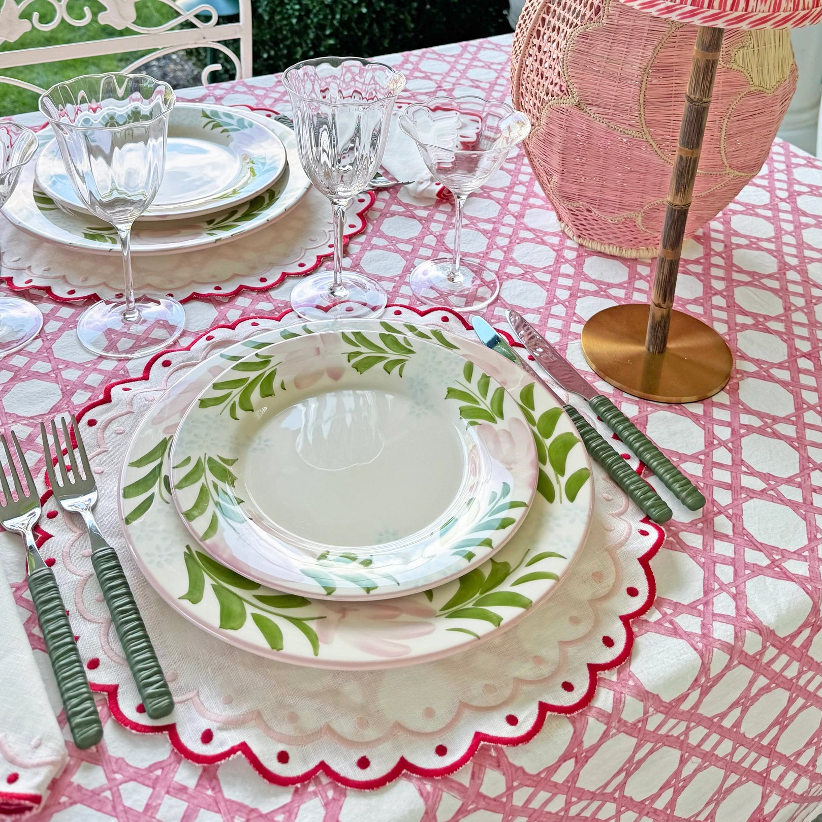 The Bamboo Pink Trellis Tablecloth brings a touch of polished charm to any setting. Printed on pure cotton with a soft trellis motif in fresh pink, it strikes the perfect balance between timeless and playful—think sunlit lunches, garden gatherings, and weekends that blend seamlessly from indoors to out. Effortlessly versatile, it pairs beautifully with rattan textures, pastel glassware, and hand-painted plates, lending a breezy sophistication to everyday meals and easy entertaining alike.