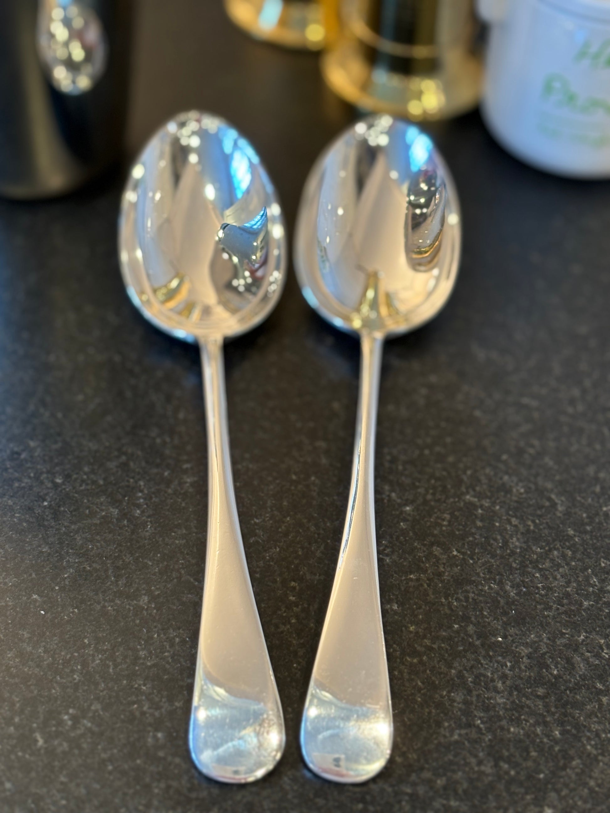 This exquisite pair of vintage kitchen spoons, sourced from the heart of England, has been lovingly re-plated in pure silver in London, restoring them to their original splendor. Generously sized and effortlessly elegant, these spoons are more than just kitchen essentials—they are our trusted companions, whether for tasting as we craft a perfect recipe or for gracefully serving side dishes at a beautifully curated buffet or dining table. Their refined, streamlined design effortlessly complements both contemporary and traditional table settings, making them as versatile as they are timeless. A true staple for those who understand the art of living well, these spoons are the quiet luxury that defines a life well-lived.