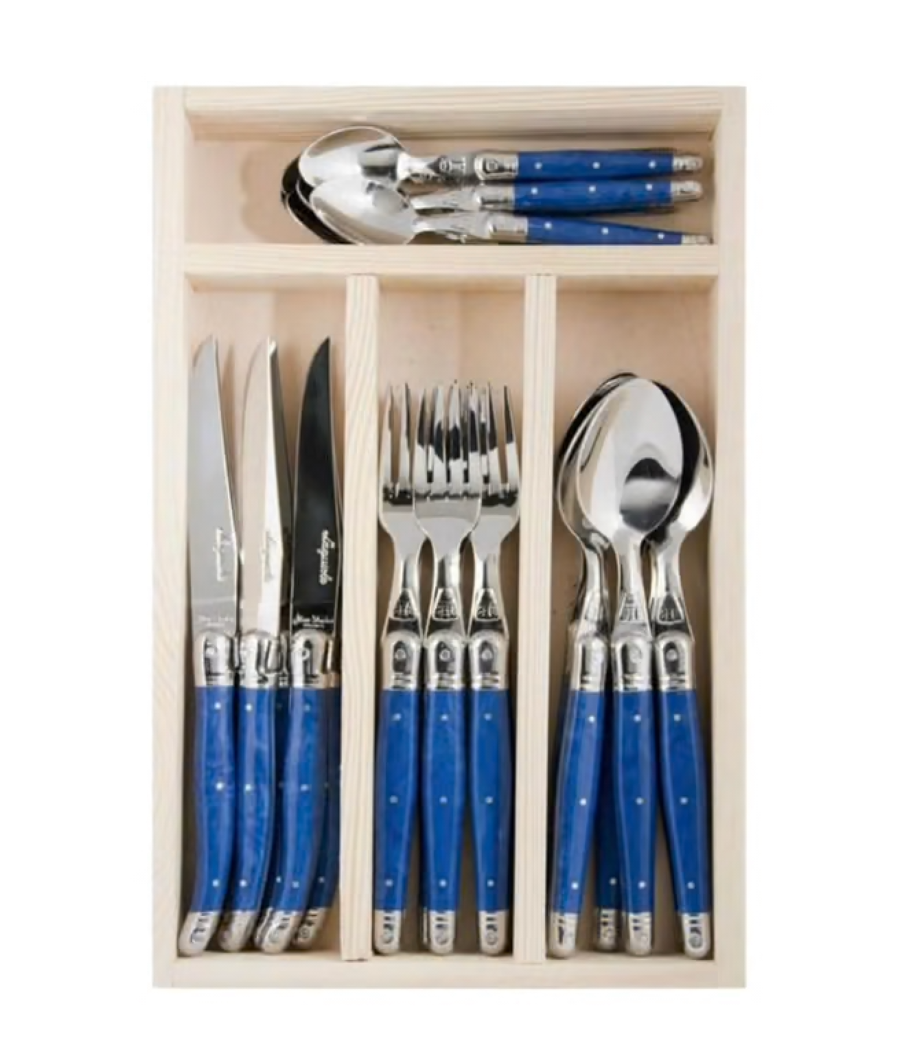 The Jean Dubost 24-piece set brings a touch of French refinement to even the simplest meal. Crafted with a graceful 1.5mm gauge and finished with luminous blue handles reminiscent of the Côte d’Azur, each fork, knife, and spoon strikes the perfect balance between relaxed elegance and quiet sophistication.